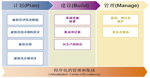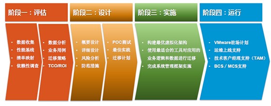 | 评估阶段 | 评估服务TCO/ROI,准确估算硬件配置(服务器数量、存储容量、性能需求、软件配置等模块内容; | 虚拟化评估报告 |